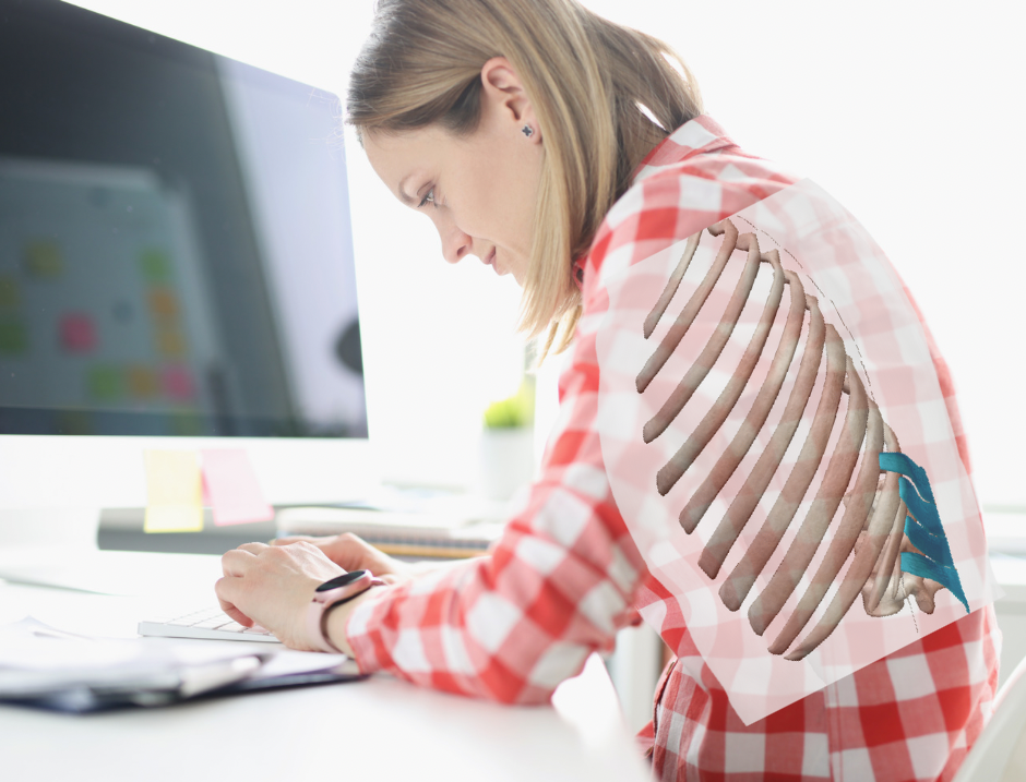 力仕事やデスクワークなどで長時間腕を使っていると肩が徐々に前に出て、猫背になり背中側の筋肉が引っ張られて硬くなります。